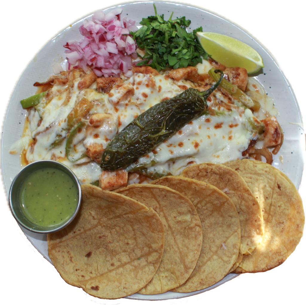 Flour or corn tortilla with your choice of al pastor (pork) or chicken mixed with melted cheese, grilled bell pepper and grilled onion. Served with fresh onion and cilantro.